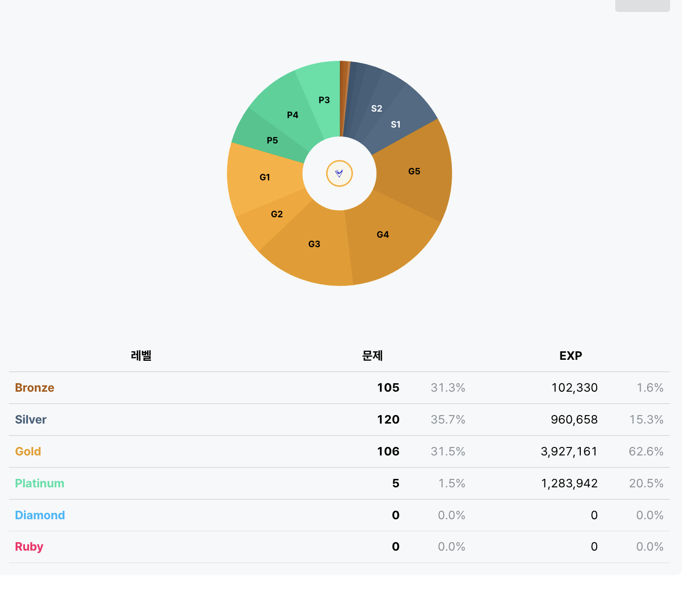 현재 백준스코어는 아래와 같다. 총 336문제 해결완료했고, 상위 7.18%에 들어와있다. 올해말까지 상위 1%안에 드는게 목표다. 골드문제 106문제 솔한 상태