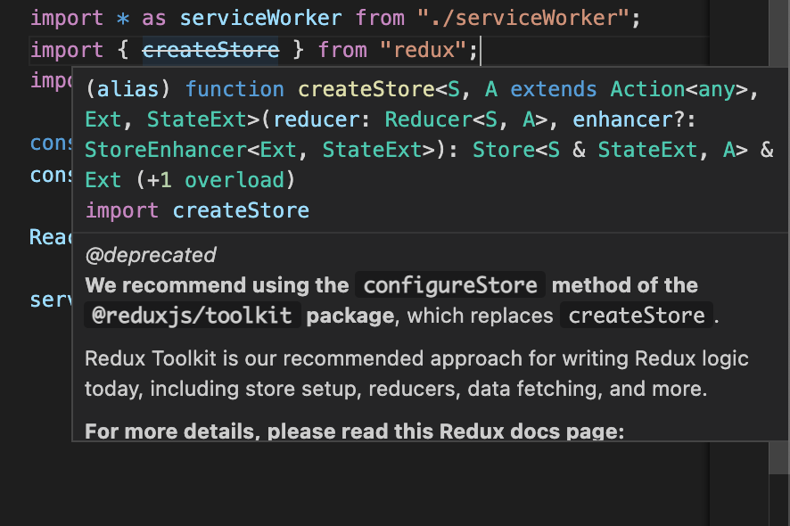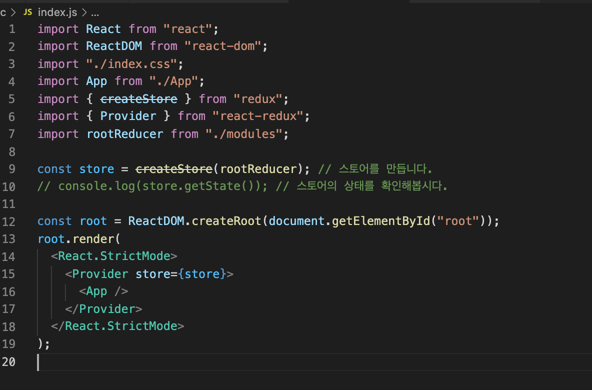 그런데 리액트 v18에선 createStore대신 configureStore를 사용할 것을 추천한다고 하니 참고하자.