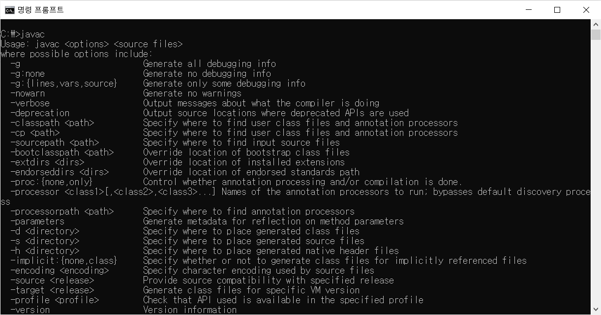 그리고 설정이 잘되었는지 cmd창에 들어가서 javac를 입력하니 아래와 같이 잘 셋팅되어 있음을 확인할 수 있다.