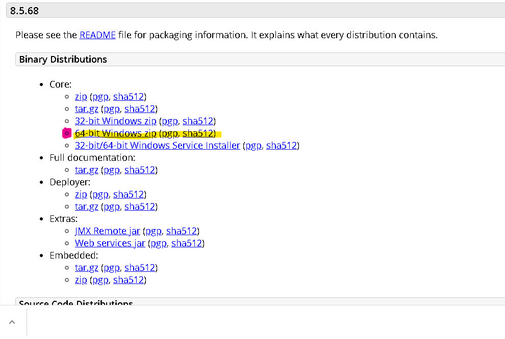 구글창에 'tomcat8'을 검색하여 아래 사이트로 들어가 노랗게 표시된 것을 다운받는다.