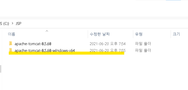 위 tomcat zip파일은 JSP폴더내에 압축해제하여 넣어준다.