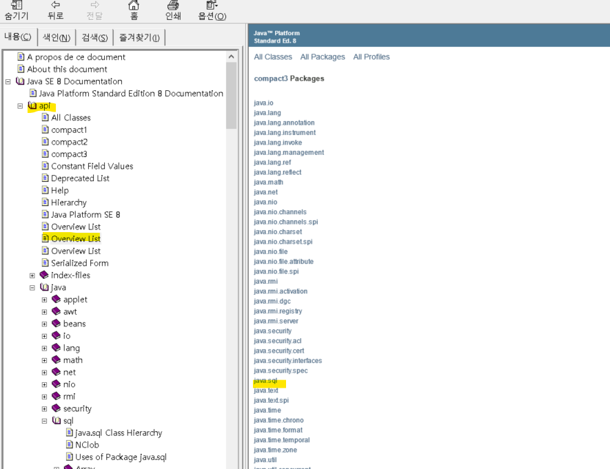 * 자료 출처: https://javadoc.allimant.org/ [Java Docs] Oracle에서 제공해주는 html 형식의 java docs 파일이 아닌 chm 으로 된 파일 입니다. 문서는 14년 버전입니다. 좀 오래 된거죠.