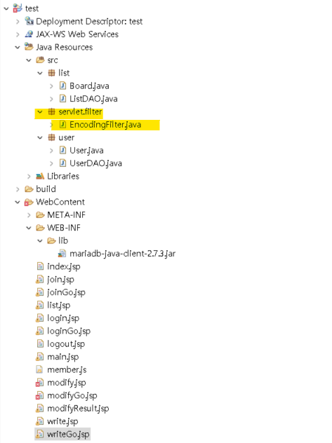 forceEncoding추가할 필요없다. filter의 package명은 servlet.filter로 했고, filter명은 EncodingFilter이다.