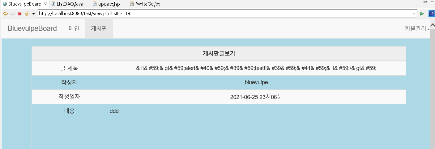 글쓰기 창 제목에 <scrpt>alert('Hi bluevulpe!')</script>를