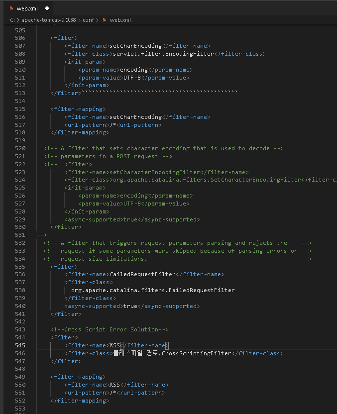 기존에 apache 폴더내 web.xml에 추가했던 필터들을 그대로 위 xml파일에 붙여넣기 해주면 된다.